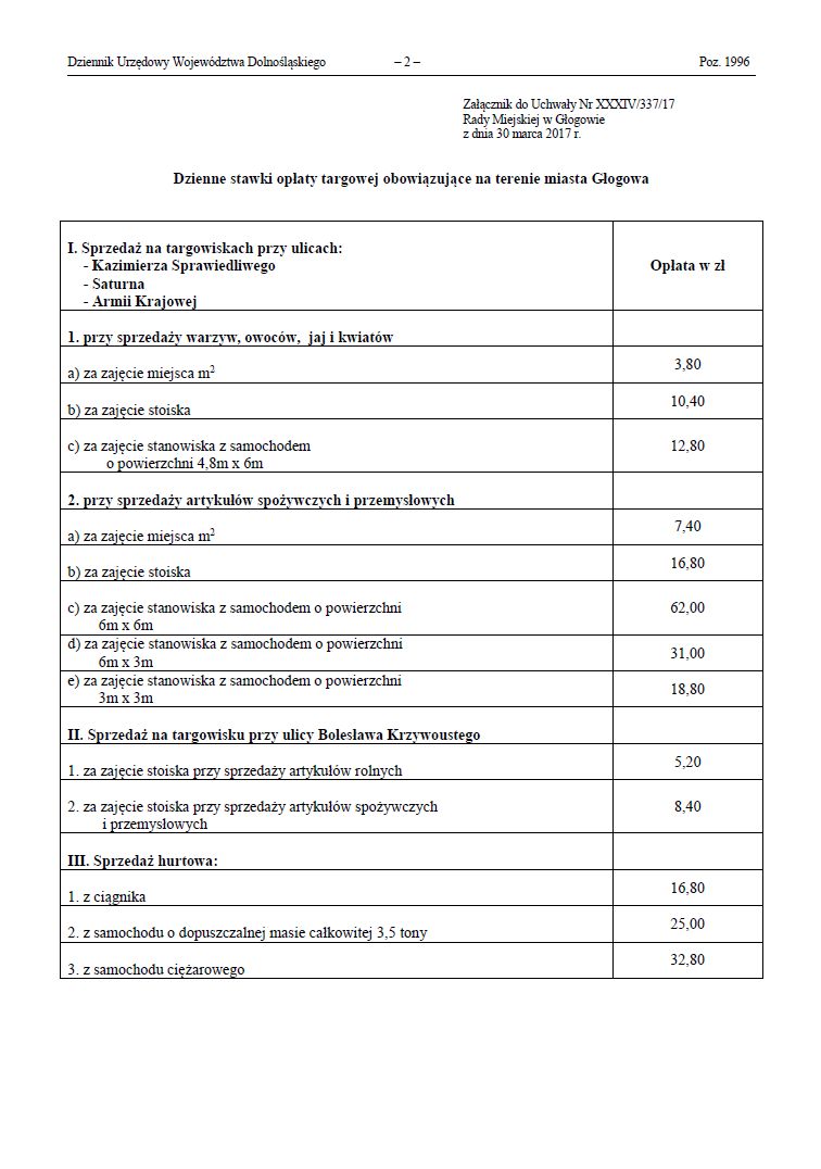 Cennik opłaty targowej (UCHWAŁA NR XXXIV/337/17 RADY MIEJSKIEJ W GŁOGOWIE z dnia 30 marca 2017 r.)